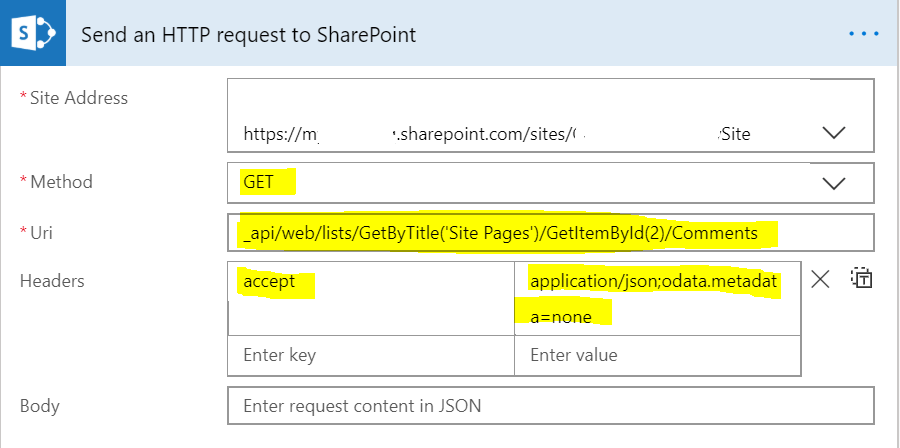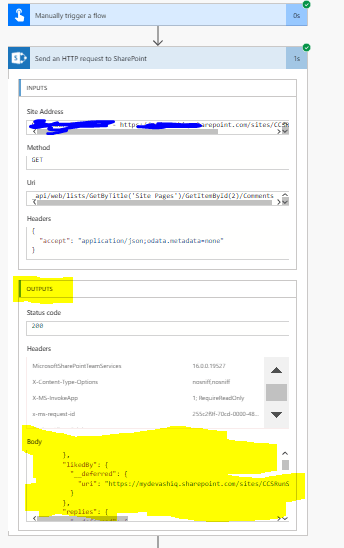 Run the flow, the output of this action would have all the data related to the comments posted by users on the page in a JSON format. To get the required information we will have to parse the JSON with the help of the Parse JSON action. Add the Parse to JSON action as below with content to the Body from Outputs of the action “Send an Http request to SharePoint”