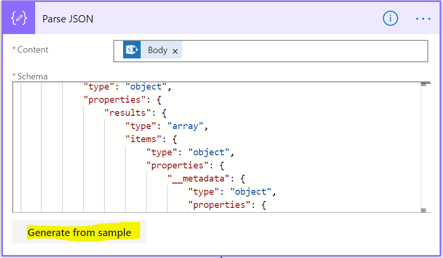 Click on the button “Generate from sample” which loads a popup “Insert a Sample JSON payload” paste the run data of the flow for generating the schema automatically. To get the run data, go to the run history and click the run and go to outputs of the action “Send an Http request to SharePoint” copy everything inside the Body
