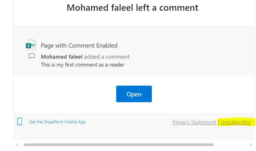 When someone comments on a page or news post, SharePoint notifies the author or the person mentioned in the header of the page via an email. The SharePoint mobile app also alerts the author whenever a comment is made. If there are multiple comments, it will be batched so that the authors receive a single email when several comments have been made within a short period of time. Additionally, author gets email notices when users reply to comments or leave a “like”. Author or a user can unsubscribe from notifications by clicking the “Unsubscribe” link in the footer of the email.