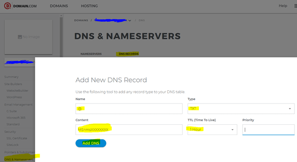 - Add the DNS record for TXT from the domain provider interface for managing the records