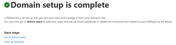 Now after all the DNS records are added, choose Continue. This will take you to the last page of the wizard with the message Domain setup is complete