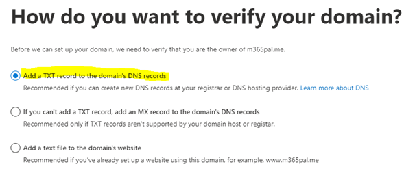 Select Add a TXT record to the domainās DNS records but you can also add a MX record or add a text file to the domainās website. Find the different options