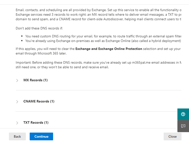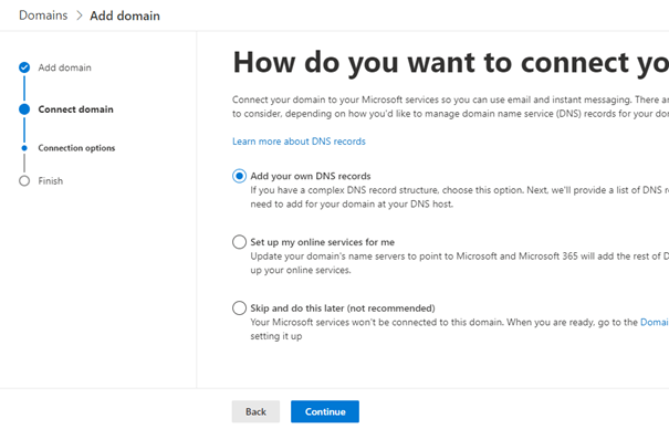 The domain is added & verified, now its time to connect the Microsoft services like Email (Exchange Online, Outlook), Mobile device Management aka MDM with the custom domain. On this post will be connecting only to Exchange online to receive email through Microsoft 365. After this setup is done Exchange online will be your new email host for the domain. After the domain is verified from the step above, select Add your own DNS records and click Continue button as shown below