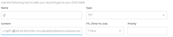 There can be only one SPF record on the DNS records so if there are another record already (default), refer this link for more information. I already had the default one so the valye for the TXT record looked like v=spf1 ip5:XX.XX.XXX.X/XX include:spf.protection.outlook.com -all