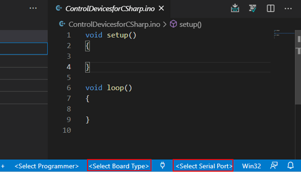 - Type the command Arduino: Initialize which will try to create a file with name app.ino. Change the name of the file relevant to your project. I have named it as ControlDevicesforCSharp.ino.