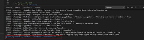 - Now you verify the sketch by pressing CTRL+AL+R if there is any compile error. If all is well, you can now upload the sketch by pressing the key CTRL+ALT+U. If the upload is successful, you will the following message on the VS output terminal