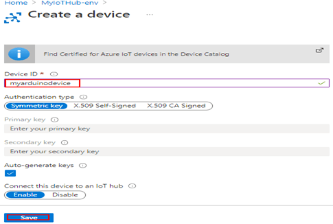 - Use the Hostname of Azure IoT Hub, Device ID, Primary key of the Device copied earlier during the setup