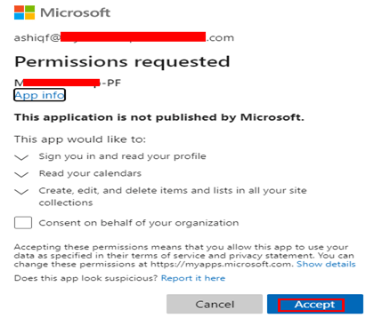 Now login to Office.com with the service account and enter the above User Consent url on a separate tab for the consent which will bring up a screen similar to the one shown below
