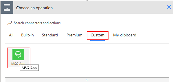 Add the action to the flow by clicking Custom and then select the custom connector as shown below