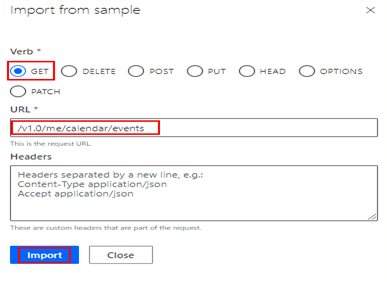 After the Summary, Description and Operation ID is entered. Click + Import from sample under the Request section to the enter the Graph API endpoint url https://graph.microsoft.com/v1.0/me/calendar/events.