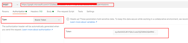 In PostMan, make a HTTP request to grant the site role to the APP 1. Replace the siteId with the actual siteId which will be a guid