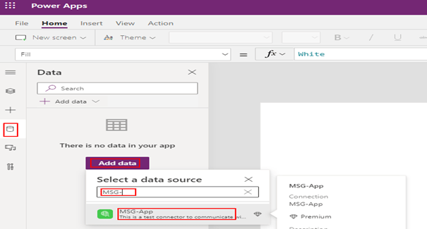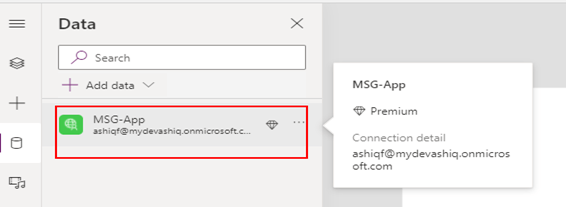 To call a custom connector in Power Apps, the first step is to add the connector to the Power App by the app maker. Click Data on the left panel and then click the button Add data > look for the connector by the name > Click the connector name to create a connection.