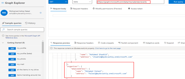 Now we are ready to provide default response for the action. To get the request response sample for the graph api endpoint, SignIn to the Graph Explorer with your organizational ID to copy the response of the API request to be used in the custom connector action