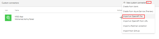 The Swagger definition file can be used to re-create the custom connector by clicking the Down arrow and then by clicking Import an OpenAPI file. On the popup window enter the Connector Name and select the downloaded Swagger file to recreate the connector after filling in information on the Security tab.