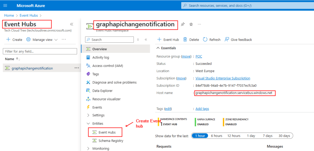 To construct the above URL, In the Overview section of the Event Hubs Namespace copy the Host Name as shown below from the screenshot and the name of your event hub as shown in the screenshot 2.