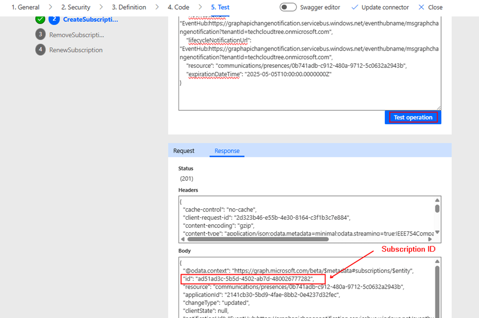 Using the custom connector built in Part 1 of this blog series, initiate the Microsoft Graph subscription by calling the Create Subscription action