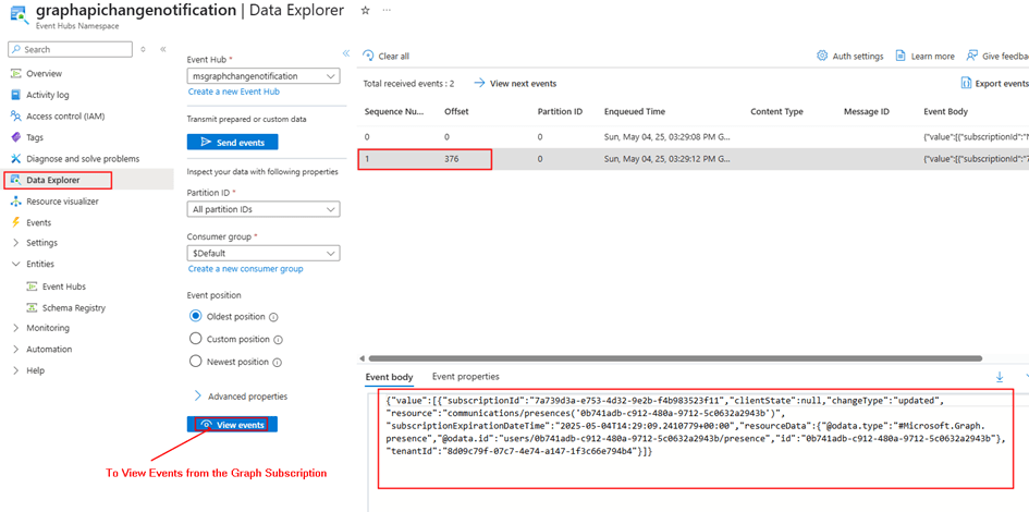 Azure Event Hub serves as a high-throughput ingestion pipeline for Microsoft Graph notifications. After the subscription is created, presence change events are pushed into the specified Event Hub.