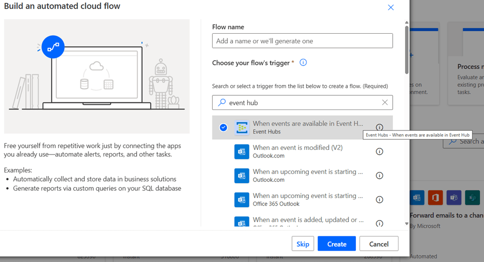 Now that presence updates are routed into Azure Event Hub, we’ll use Power Automate to process these updates.