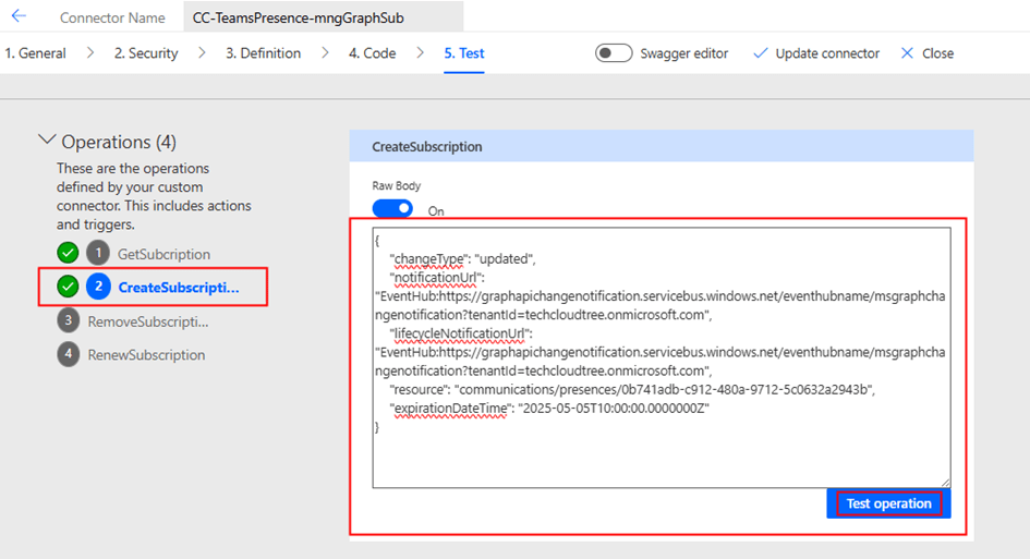 Once the connection is created, return to the edit mode of the custom connector to initiate testing of the actions. Navigate to the Test tab, where you can select the specific connection and choose the operation you wish to test. Test the operation and validate the results of the custom connector action.