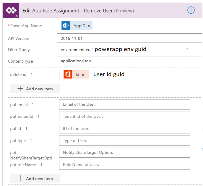 Action to Revoke Power App access, its the same action we used for adding user to an app but with some different parameters as shown below