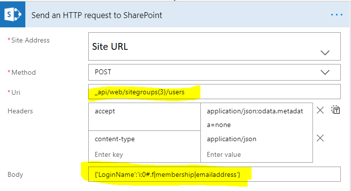 Now let’s add an action to grant the user access to SharePoint site. I would be using a flow action “Send an HTTP request to SharePoint” to call a Rest API (POST) to get the user added to the SP site groups (Members/Viewers/Visitors). The connection for this action should have access (Site Owner) to share the site. Find the rest api details to add the user to a group