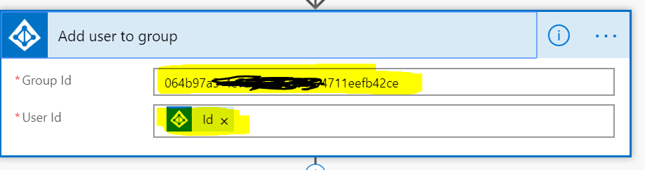 Now add the action Add user to group, the Group Id should be for the Security group which has a license assigned to it. The User Id field should be dynamic value Id from the previous action Create user.