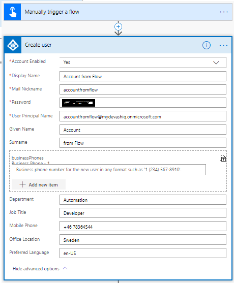 Let’s now create the flow, I have used an Instant flow with trigger Manually Trigger a flow. Add the action Create user from the connector Azure AD