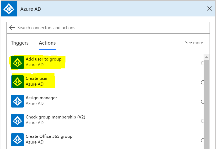 There is a flow action Add user to group under the same connector for adding the user to the security group, all the members of the group will get the license assigned on that group. The Azure AD connector does not return custom attributes of Azure AD. For e.g you can’t assign a value to a custom AD attribute with the Create user action, if you want to assign a custom attribute or an attribute which is not exposed in the Create User action then the account has to be created using PowerShell. There are ways to call a PowerShell script from Azure Automation Runbooks with the help of a flow action.